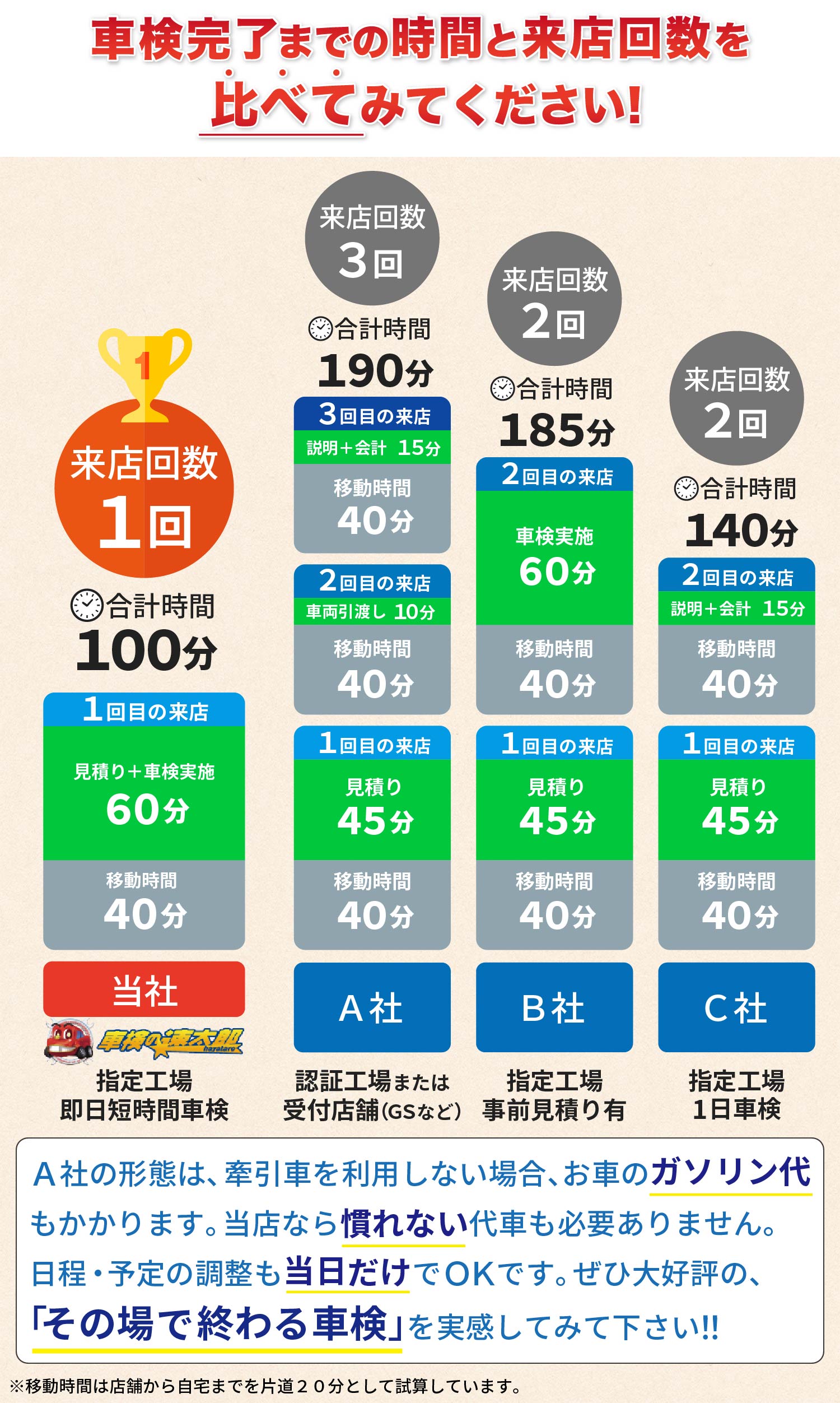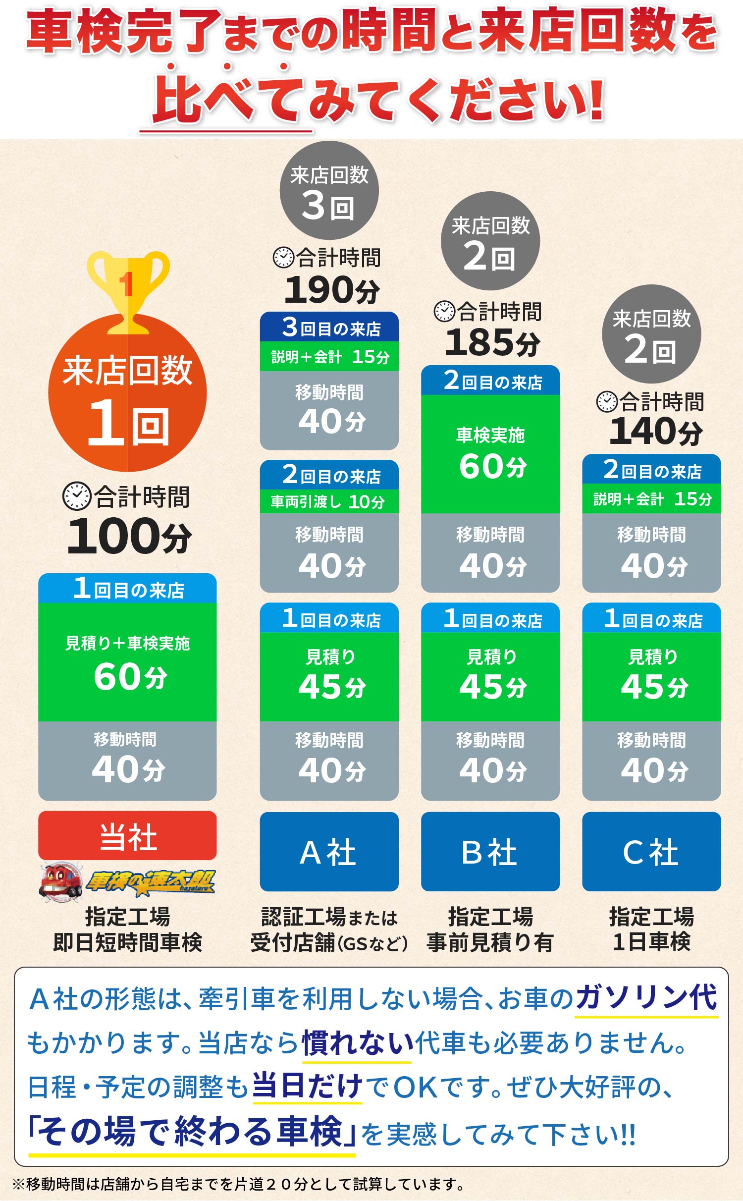 「車検の速太郎」江戸川一之江店は、短時間車検を基本としておりますが、整備箇所が多い場合や部品取り寄せが発生した場合など、短時間で車検が完了できない場合も中にはございます。