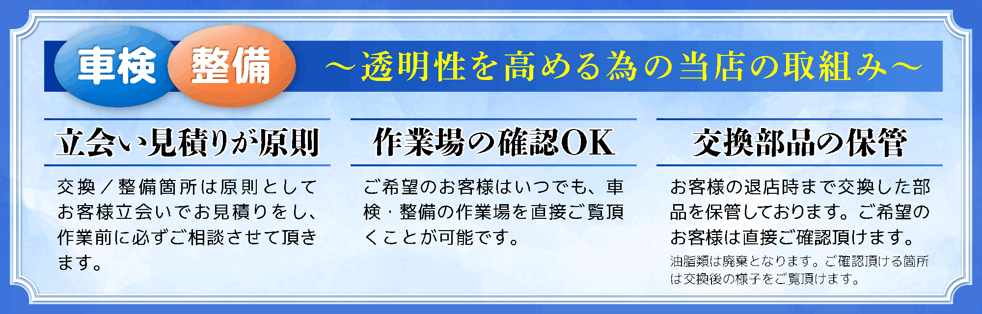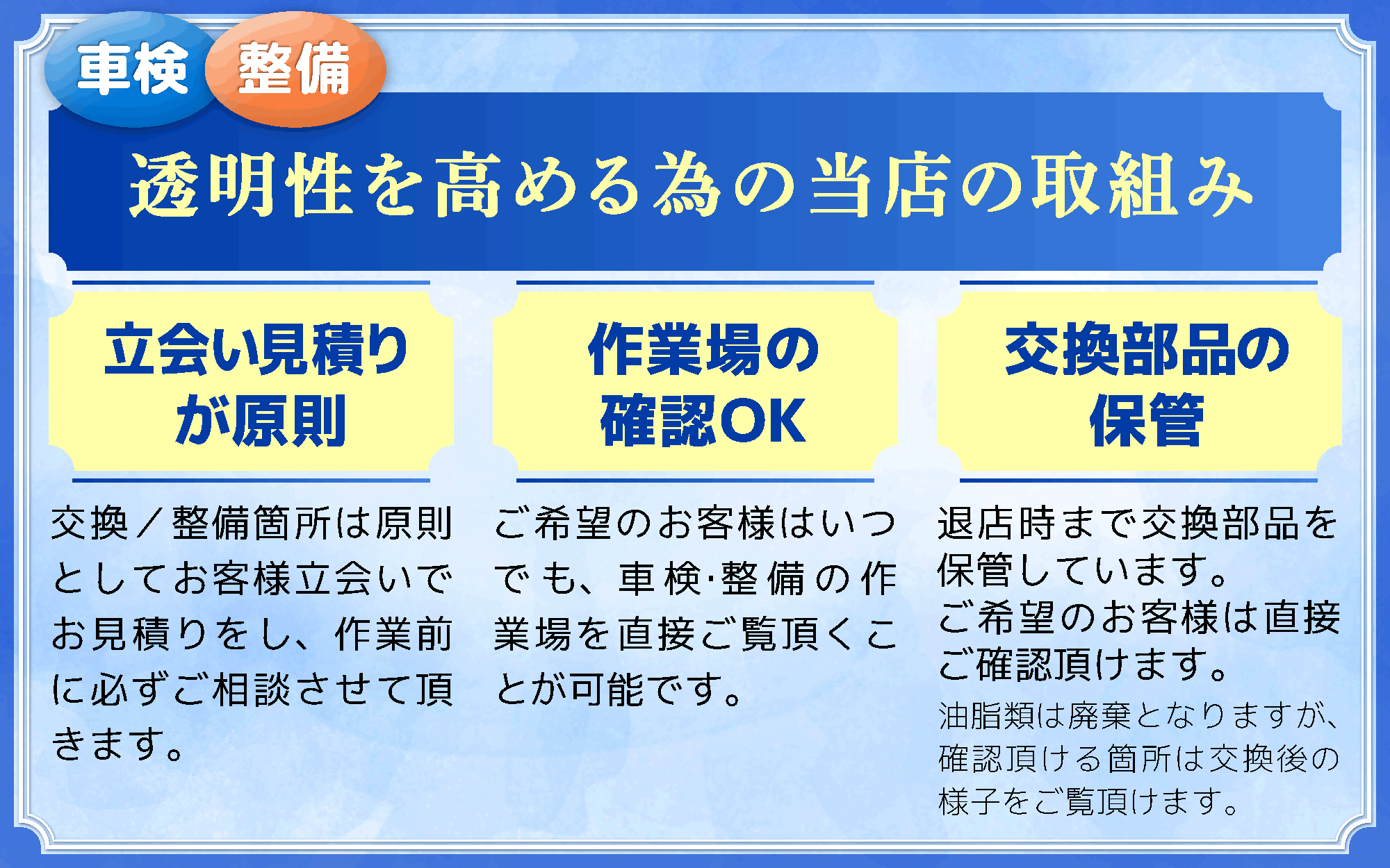 見積書と部品を照らし合わせながら丁寧に説明頂けたのはとても感動いたしました。今まで他店で車検を行う際に同様の対応をして頂いたことが無かったからです。